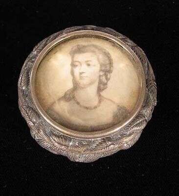 The naturalistic repousse side and hinged lid surmounted by miniature bust-length portrait of a young maiden. Diam: 2 in.