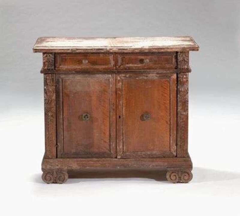 The rectangular molded top over two short drawers flanked by acanthus scroll corbels, the lower compartments with two doors flanked by caryatids, the whole supported on a molded base raised on double scroll bracket feet. H: 36, W: 41 1/4, D: 16 in.