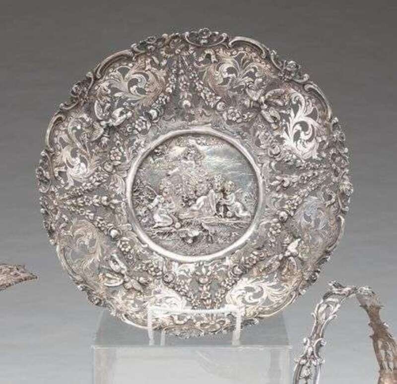 The ornate openwork sides embossed with birds, flaming torches, trailing flowers and swags, centrally decorated with four playful putti. Diam 12 1/2 in. 21 oz.