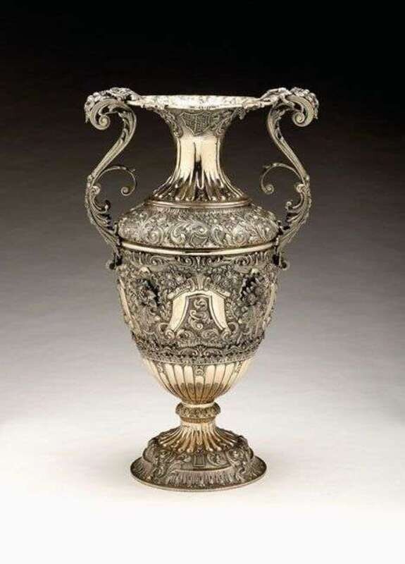 Impressed Cesselatti, of classical form, the flared neck with twin scroll handles applied with fruit and fruiting vines, the baluster sides chased and embossed, shells, scrolls and foliage, raised on a part fluted circular foot. H: 25 1/2 in. 258 oz.