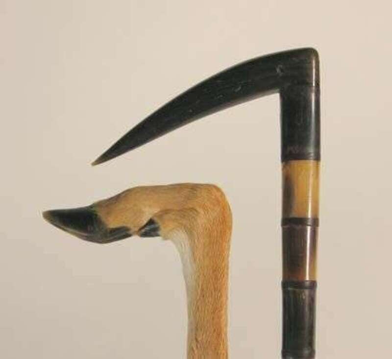 The sectional tapered shaft with a pointed angular "L" handle and brass ferrule, overall length 35 inches; together with an Austrian hoof handled walking cane, the tapered shaft with a bone ferrule, overall length 34 3/4 inches.