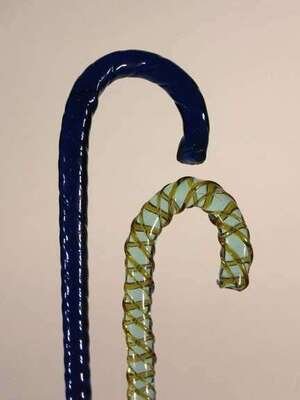 The pale green example with amber spiral overlay and a crook handle, the other a spiral crook handled Bristol blue example.