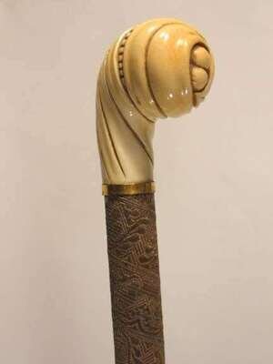 The silk wrapped tapered shaft with a bud carved handle, the foliate engraved blade with reserves depicting jousting and standing knights.