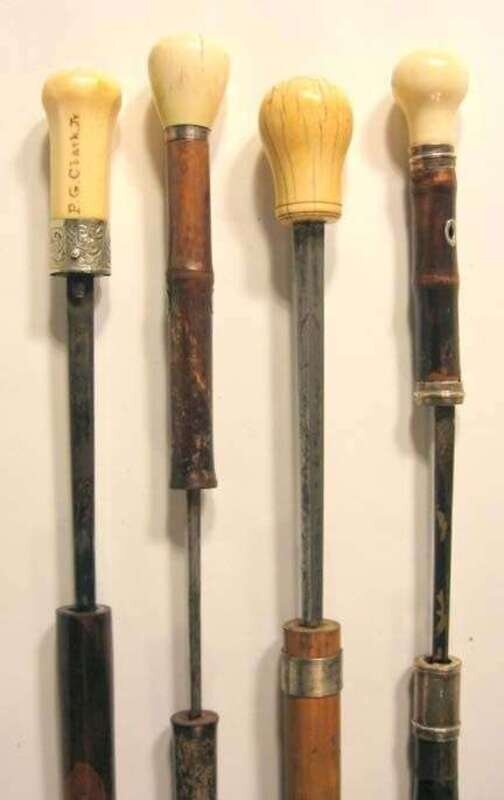 With knop handles, three with bamboo tapered shafts the other with a tapered wood shaft the handle inscribed, "P.G. Clark JR".