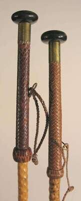 The medlar wood shafts with woven leather grips with horn mushroom shaped pummels, the leather tops unscrew to reveal a long pointed spike.