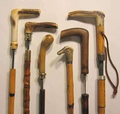 One with a rosewood tapered shaft and knop handle, the others with bamboo shafts and "L" handles.