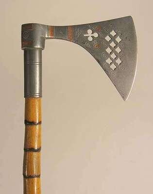 The bamboo shaft surmounted by a pierced steel axe head handle, the stiletto covered by a metal ferrule.