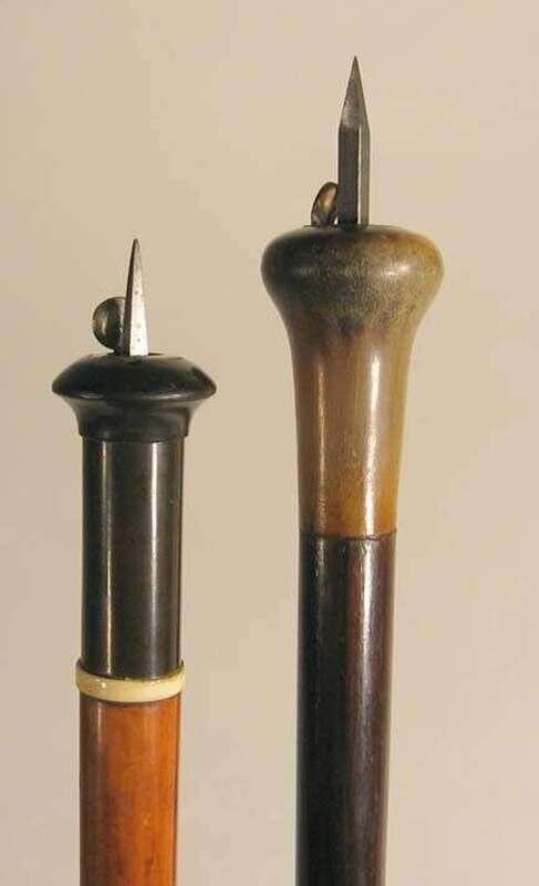One with a tapered rosewood shaft and horn knop handle, the other with a tapered walnut shaft and a Bakelite handle, each handle releasing a stiletto blade. Largest overall length 36, the other 35 in.