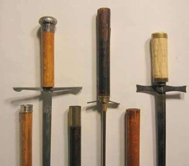 With tapered malacca shafts, one with a bone handle, each with spring-activated hand guards. Bone handled cane 36 1/2 overall length, the other 35 1/2 inches. Together with a Japanese silver birch veneered example with an overall length of 36 inches.