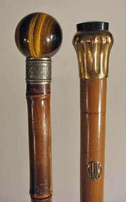 The bamboo tapered shaft with a silvered ferrule and globular tiger's-eye handle, overall length 36 inches; together with a malacca walking cane with a silver gilt and bloodstone handle, overall length 33 3/4 inches.