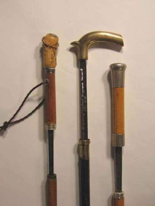 The English example with a tapered shaft and silver knop handle, another with a bamboo shaft and naturalistic horn handle, the other with a leather shaft and brass "L" shaped handle, the polished steel blade engraved, "Prime Minister of England, Benjamin Disraeli, 1867-1874".