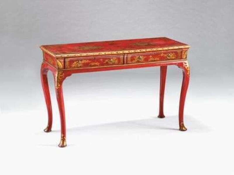 The later red chinoiserie lacquer with a molded top over two frieze drawers raised on cabriole legs ending in pad feet..