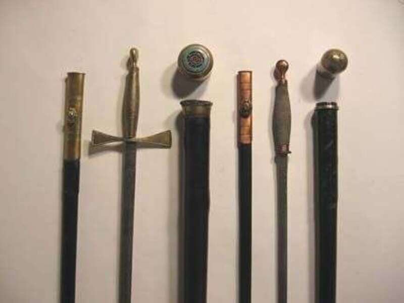 The tapered shaft with a removable brass handle, surmounted by a blue enamel band enscribed, "Grand Master's Lodge, 1759", opening to reveal a brass handled dress sword with foliate engraved, polished steel blade and leather sheath; together with another example, the polished steel blade inscribed, "Kenning London, Liverpool, Manchester, Glasgow".