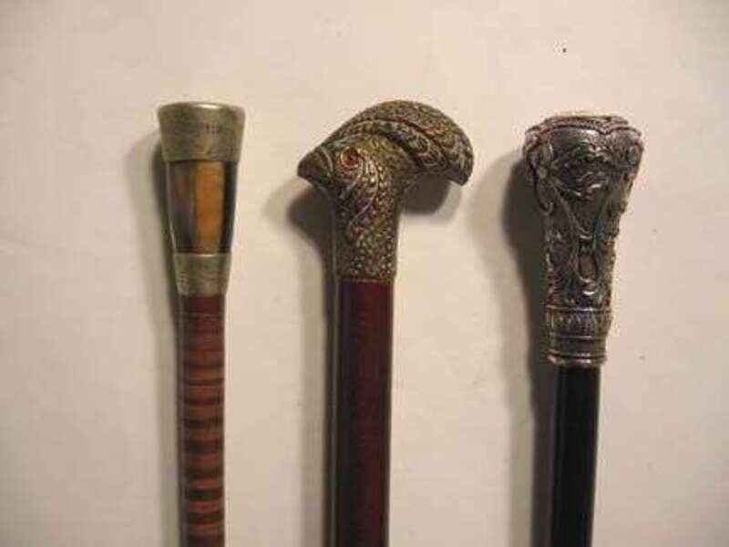 The first with a plain tapered shaft surmounted by a gilt metal pheasant's head with glass eyes, the second with an ebonized tapered shaft and a repousse silver plate handle with a transfer-printed pillbox lid, the third with a stacked disc wooden shaft and an abalone and mother-of-pearl mounted handle. (3).