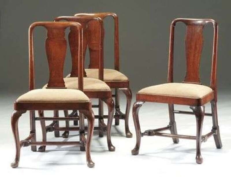 With vase-shaped splats and drop-in seats, raised on cabriole legs, united by turned H-shape stretchers and ending in pad feet (4).