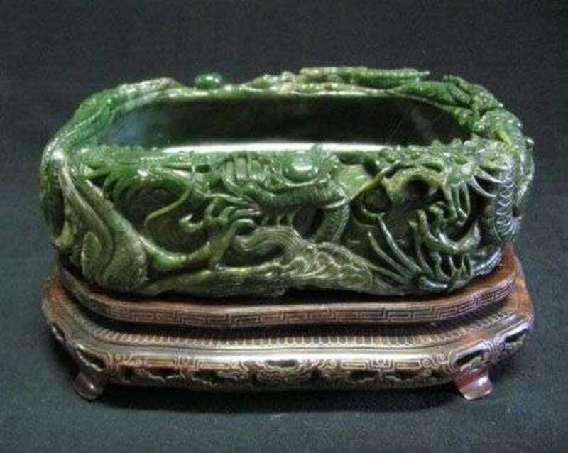 Of oblong form, the sides carved in high relief with dragons and clouds, on a silver inlaid pierced hardwood base. (repaired).