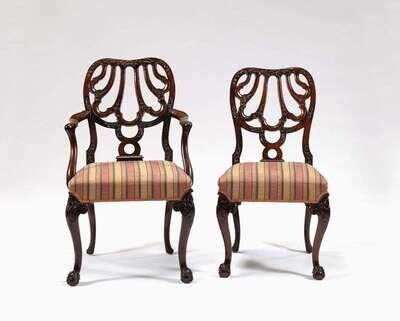 Including one armchair, comprising a set of eight and two matching, with openwork shell carved backs, raised on acanthus carved cabriole legs ending in claw and ball feet.