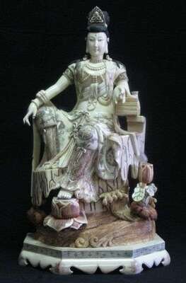 Seated on a throne and rocaille base, raised on a canted stand with serpentine shaped apron. H: 21 in.