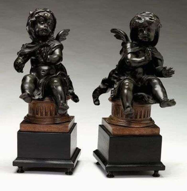 Modeled as two draped seated putti, raised on fluted wood pedestals and square bases. H: 9 1/2, H: 18 1/4 in (including bases).
