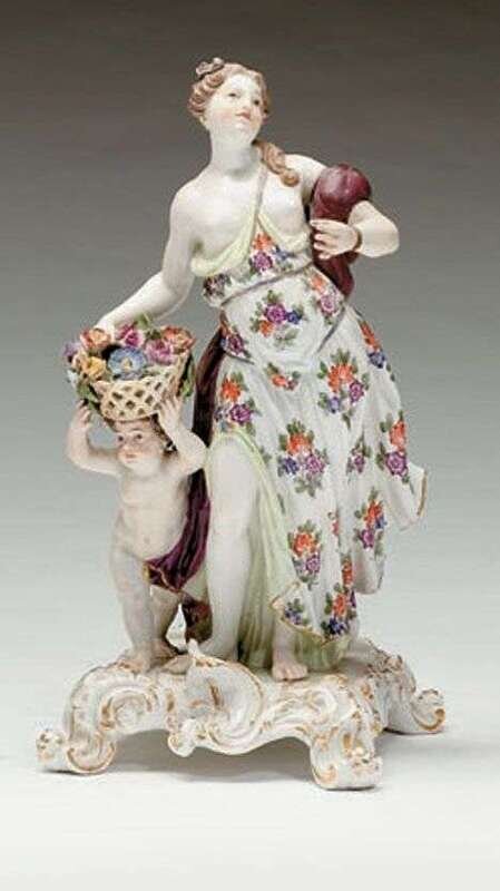 Modeled as a semi-nude classical draped female, beside her stands a cherub holding a basket of flowers over his head, raised on a rococo scroll base, blue crossed swords marks.