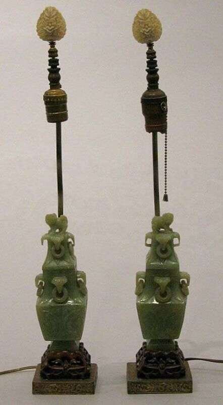Mounted as lamps, of square form, surmounted by fu lion finials and carved with elephant mask and loop handles, the shades surmounted by carved ivory finials. .