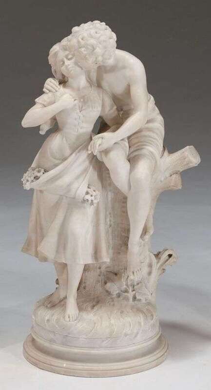 Depicting 'The First Kiss' by Cipriani, raised on an ogee molded circular base.