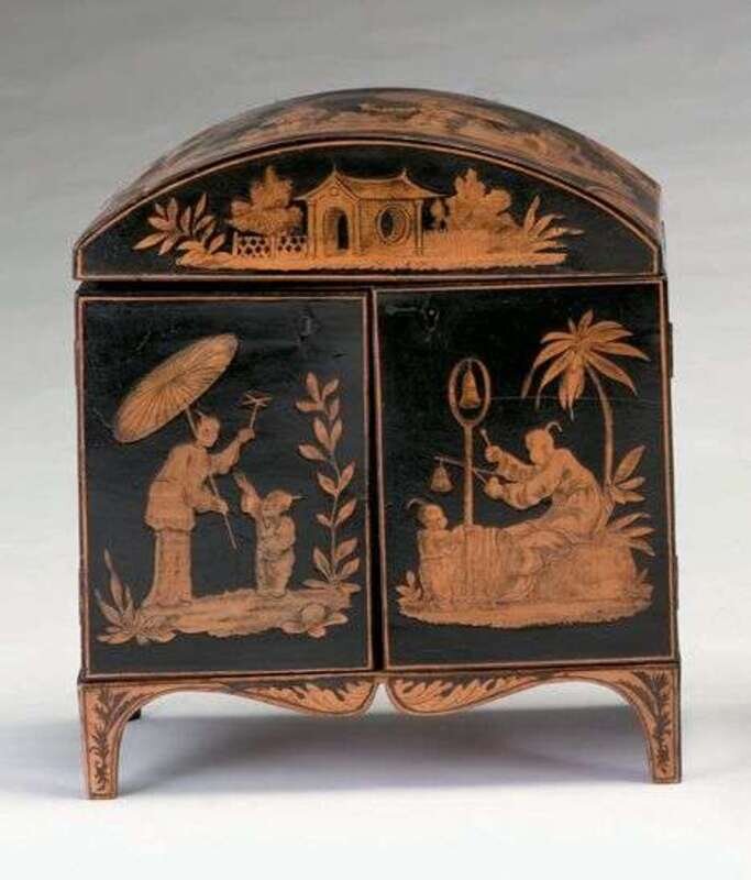 The domed hinged top and two cupboard doors with chinoiserie decoration, opening to reveal a galleried compartment over two short and two long drawers, raised on bracket feet. H: 12 1/2, W: 11, D: 6 in.