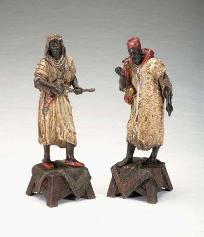 Each modeled as a standing arab decorated in polychrome, raised on rug draped pedestal bases. H: 18 in.