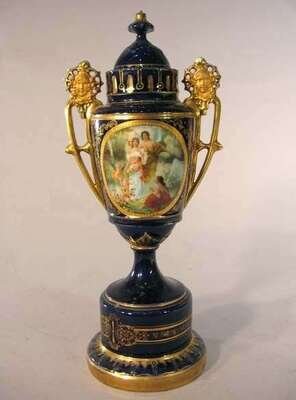 With a domed cover and twin mask handles, decorated with a figural oval reserve on a cobalt blue gilt enhanced ground, blue beehive mark. H: 15 in.