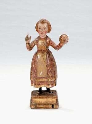 Depicting a young Christ with one hand raised the other holding an orb, raised on a rectangular bombe base. H: 24 1/2 in.