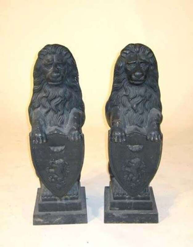 Modeled as rampant lions supporting a shield, raised on stepped square bases. H: 31 in.