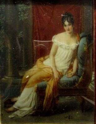 Painted with a young beauty reclining on a bergere wearing a white gown with orange drape, in an ornate pierced gilt bronze frame. H: 3 1/4, W: 2 1/2 in.