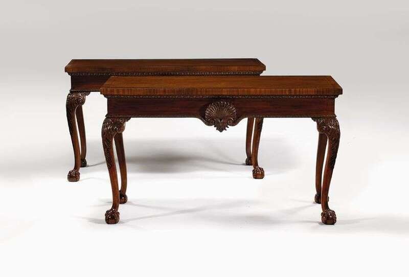 The rectangular top over an egg and dart molded plain frieze centered by shell and water carving, raised on acanthus carved cabriole legs on claw and ball feet. H: 33 1/2, W: 57, D: 24 1/2 in. (2).