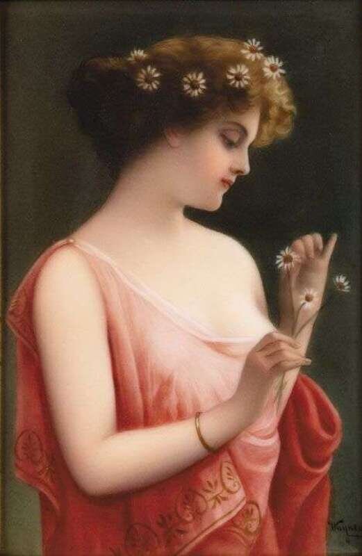 Finely painted with a young beauty wearing a pink dress and with a daisy in her hair, framed. H: 5 3/4, W: 4 in.