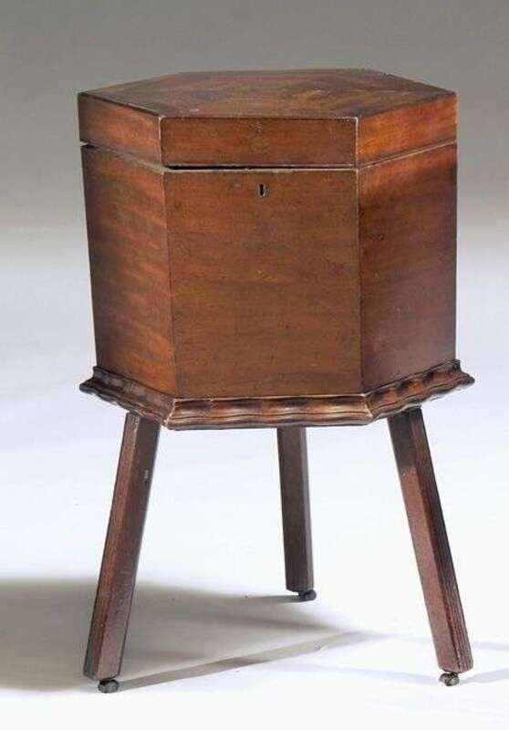 The body of hexagonal form, the base with wavy molding, on three reeded square legs with casters, the interior with lead liner. H: 29 D: 16 in.