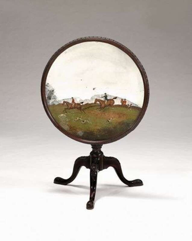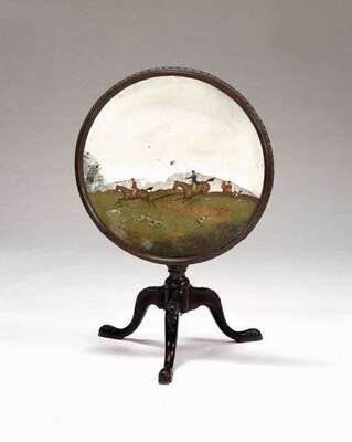 With acanthus molded edge enclosing a mirrored panel, depicting a hunting scene, on a turned columnar support, raised on three carved cabriole legs ending in acanthus carved feet.