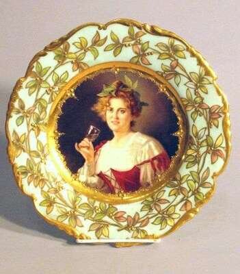 Depicting an auburn beauty holding a glass of wine, within a blue ground border with scrolling vines signed B. Zickel, blue overglaze mark to back. Diam: 9 1/2 in.
