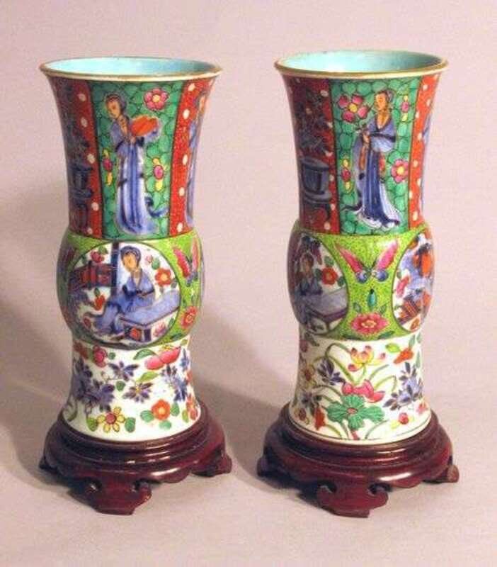 Of trumpet form, each decorated in polychrome with figural panels, flowering urns, butterflies and scrolling foliage, signed. H: 9 1/2 in.