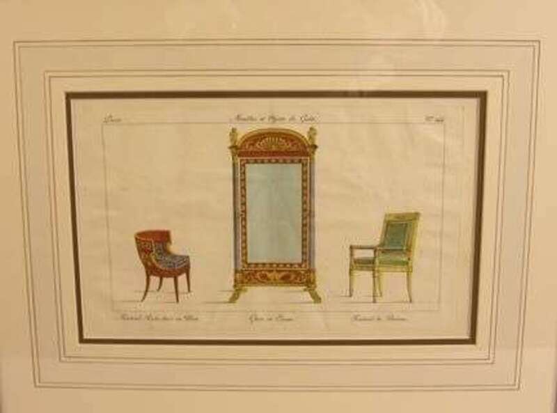 Nine framed hand-colored engravings of furniture from 'Meubles et Objets de Gout' Paris, 1814