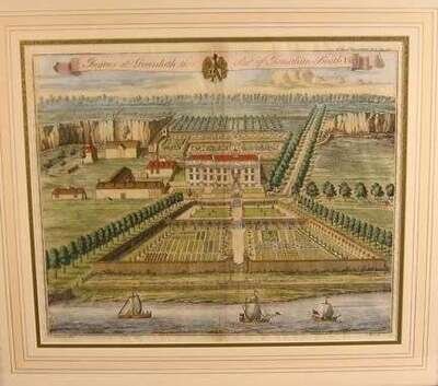 Two framed hand-colored engravings of gardens and estates by Johaan Kip London, 1725