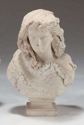Modeled as a classical maiden wearing a fur coat with long flowing hair, raised on an ogee rectangular pedestal base, H: 26 in; together with an onyx pedestal.