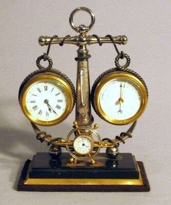 The central anchor form support centered by a thermometer and flanked by a clock and a barometer, the rectangular base surmounted by a ship's wheel form calendar. H: 9 1/2 in.