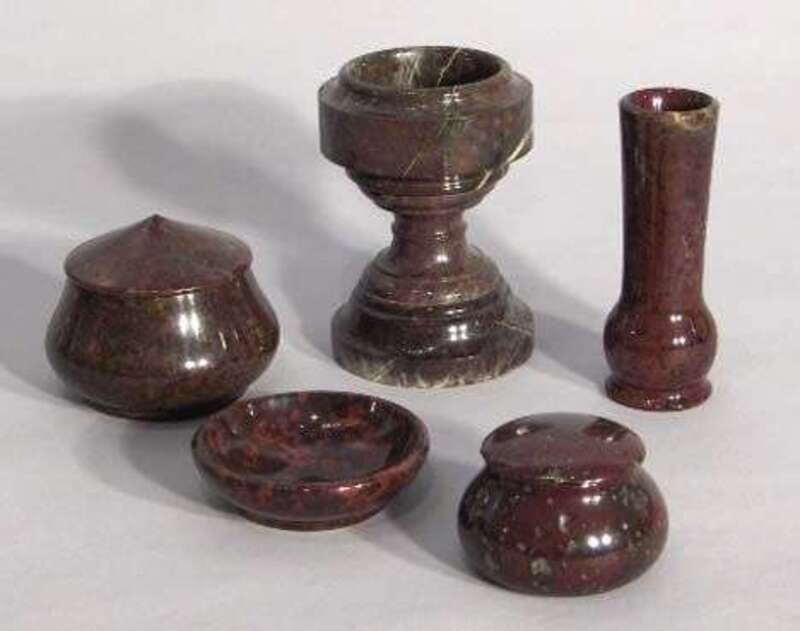 Raised on a socle base. H: 5 in, together with four other polished stone table items. (5).