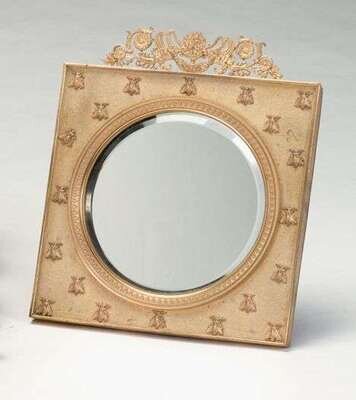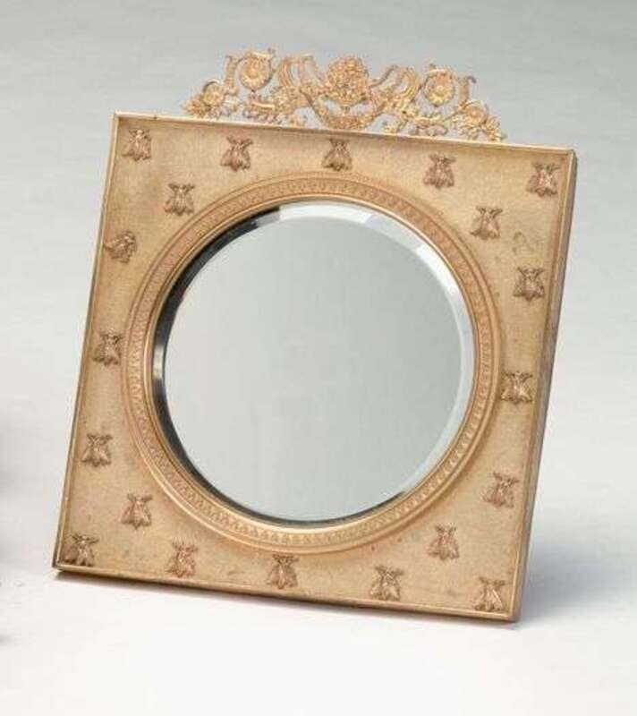 The circular beveled plate within a square frame applied with bees, the ornate openwork scroll surmount, centered by a flowering urn, flanked by swans, impressed windmill mark, Marque depose, Paris. H: 12 in.