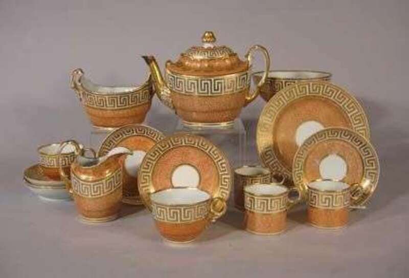 Comprising a teapot sugar bowl, slop bowl, side plate, a creamer, six tea cups and saucers and six coffee cans, the pink grounds enriched with gilt scrolls, within Greek borders. Teapot, H: 7 in. 23 pieces.