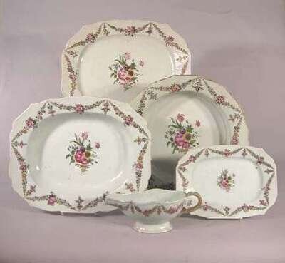 Comprising a deep round charger, two platters, a gravy boat and under tray, all enameled with famille rose palette, foliate swags below the shaped rims around a central foliate spray.