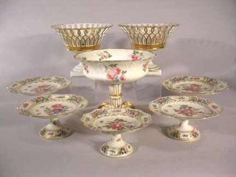 Each painted with flower sprays against a white gilt enhanced ground, gold printed marks. Largest, dia: 9, smallest, dia: 6 1/2 in.; together with a Paris porcelain centerpiece, 19th century, H: 8, W: 10 in.; and a pair of Paris porcelain pierced baskets, 19th century, raised on socle bases. H: 7 1/2, dia: 9 in.