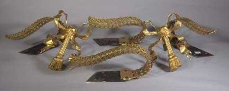 Of scrolling openwork anthemion form; together with a pair of gilt bronze curtain tie backs of ribbon-tied tassel form. (6).
