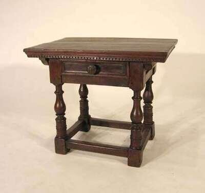 The rectangular top over a chip carved frieze and one drawer, raised on baluster turned legs united by a peripheral stretcher. H: 24 1/2, W: 29, D: 20 in.