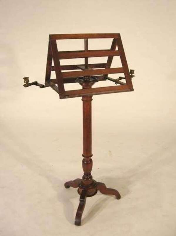 The adjustable swivel book supports with extending candle arms, on a plain columnar and urn form pillar base raised on three down scrolling legs. H: 47 in.